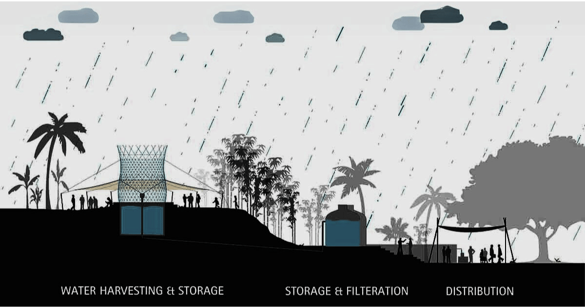 Water collected from the air travels down the mesh and into a central storage tank at the base. From here, villagers can access it for: